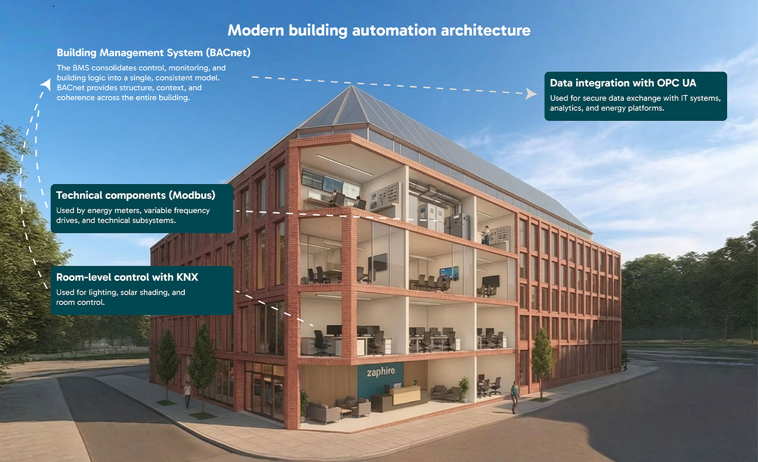 Through clear interfaces and a deliberate role distribution between protocols, existing equipment can be reused in the BMS without compromising structure, security, or future flexibility. Zaphire BMS therefore enables stepwise modernisation, allowing buildings to evolve over time rather than having to be rebuilt from scratch.